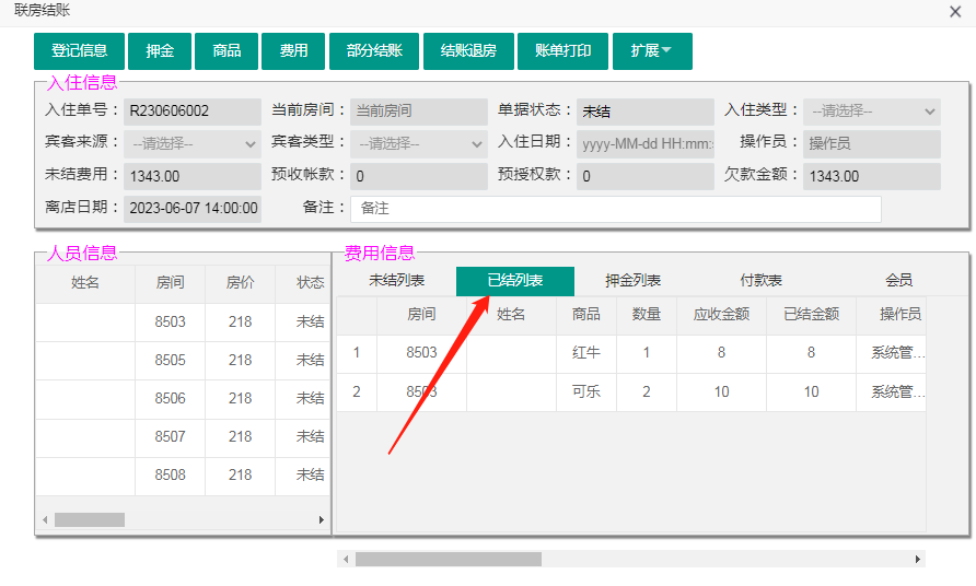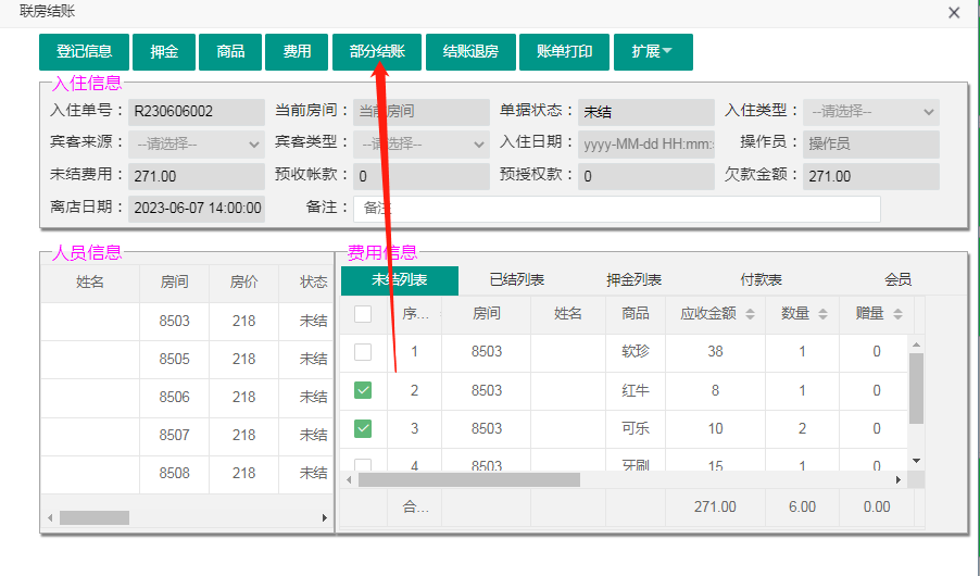 1、房态图对应房间,双击,如果联房选择联房账务,单房选择单房账务。